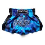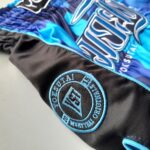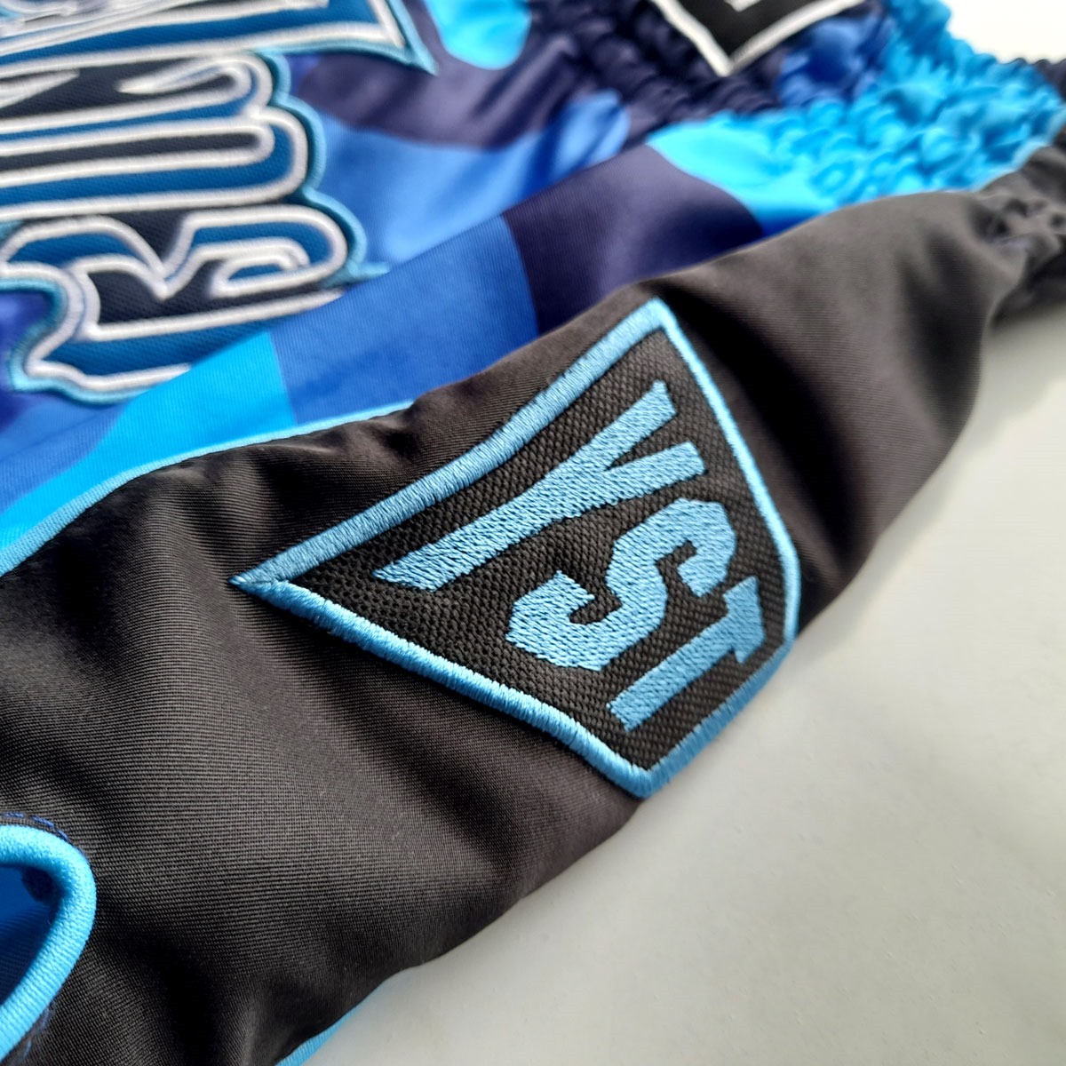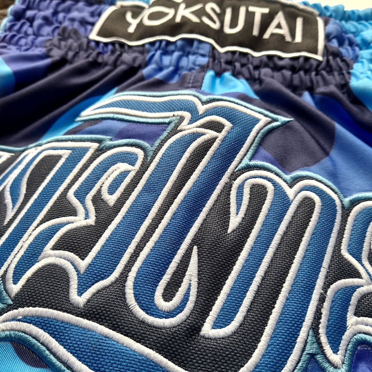 Short em tecido 100% poliester, estampado em camuflado azul com aplicação de bordado Muaythai no centro e faixas laterais bordadas.