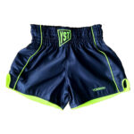 Short de Muaythai Yoksutai azul marinho com detalhes em verde fluor, 100% poliester.