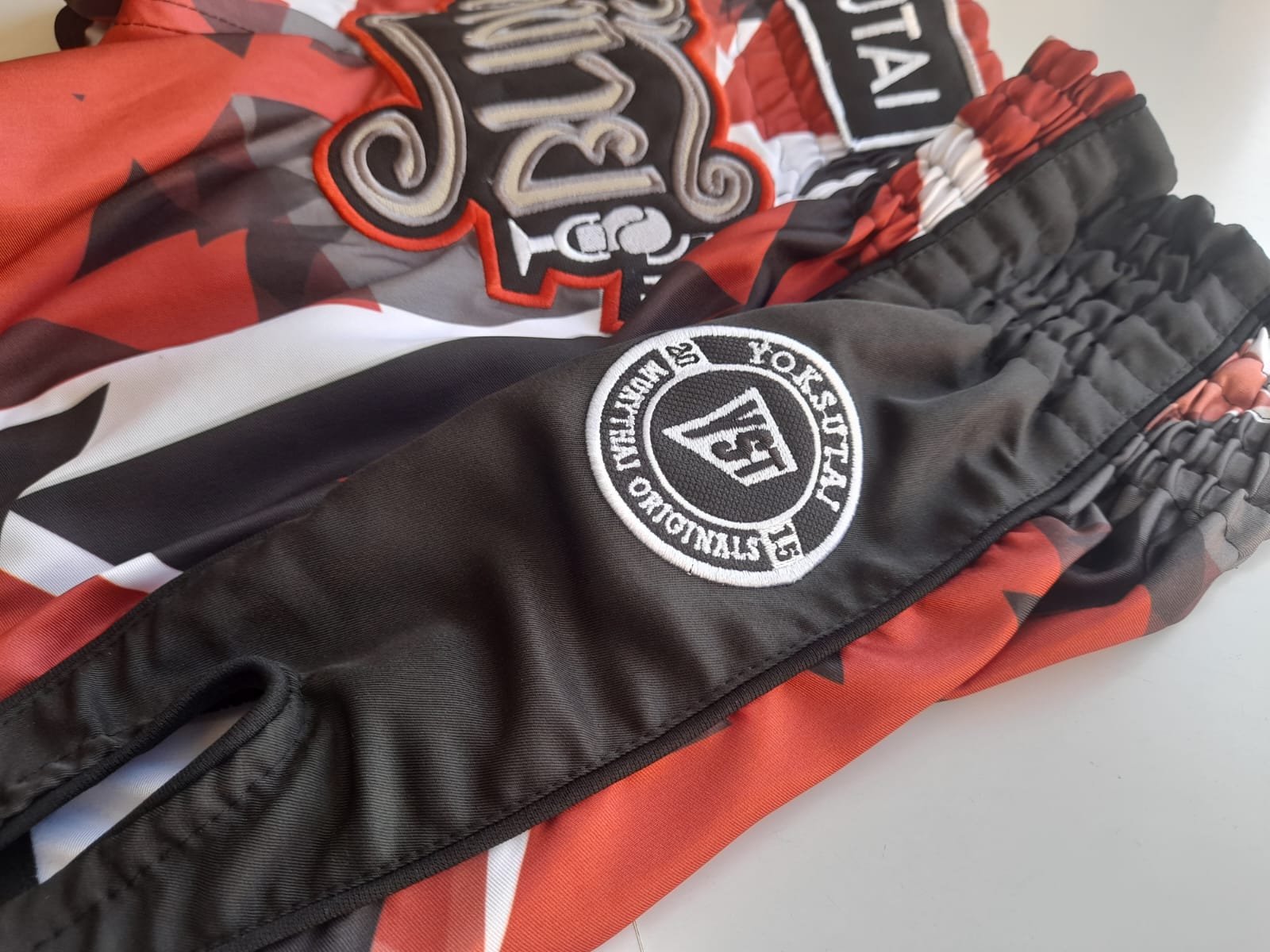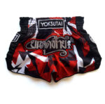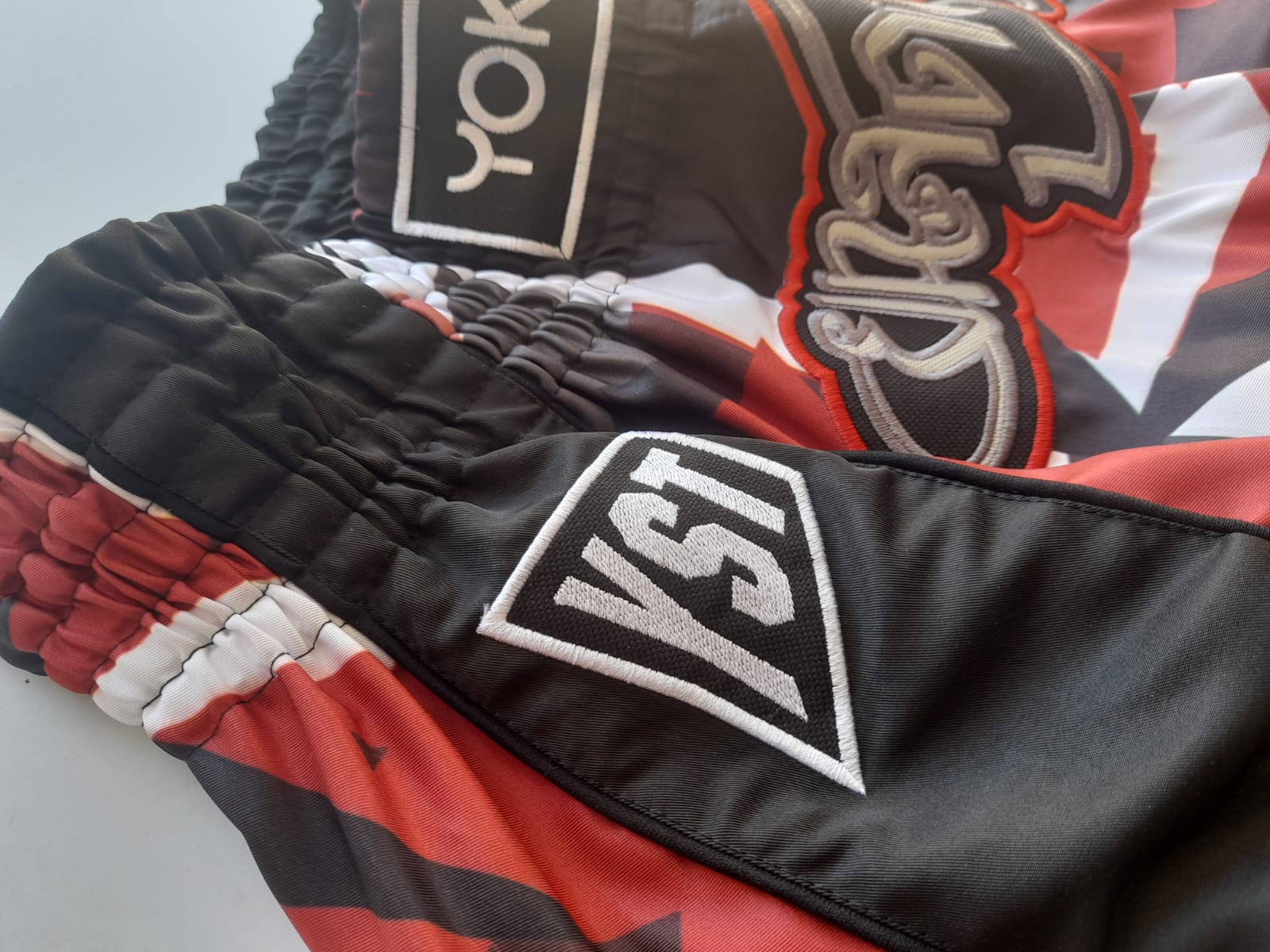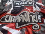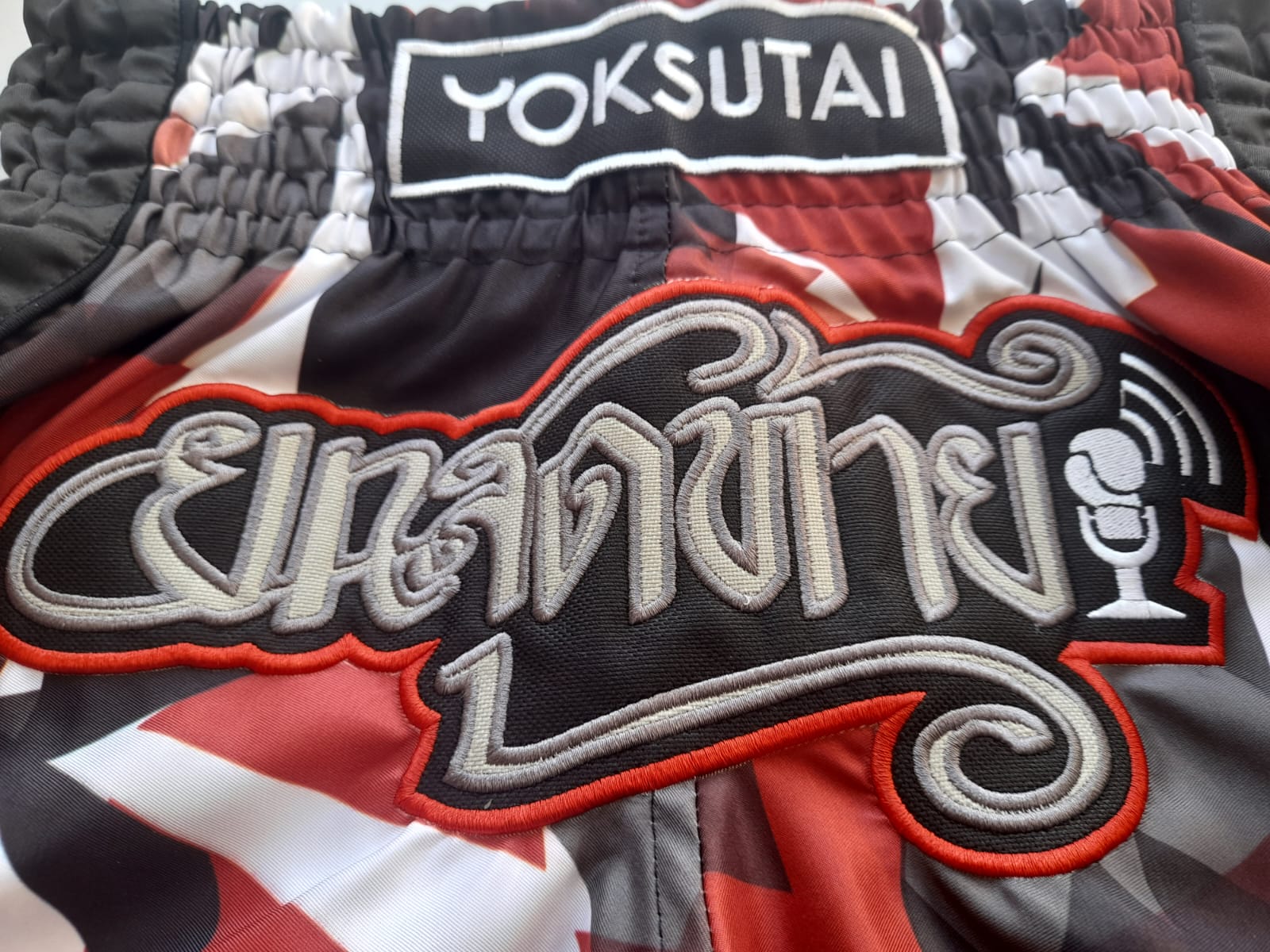 Short de Muaythai Yoksutai bordado 100% poliester escrito Yoksutai em tailandes bordado na frente e faixas laterais bordadas.